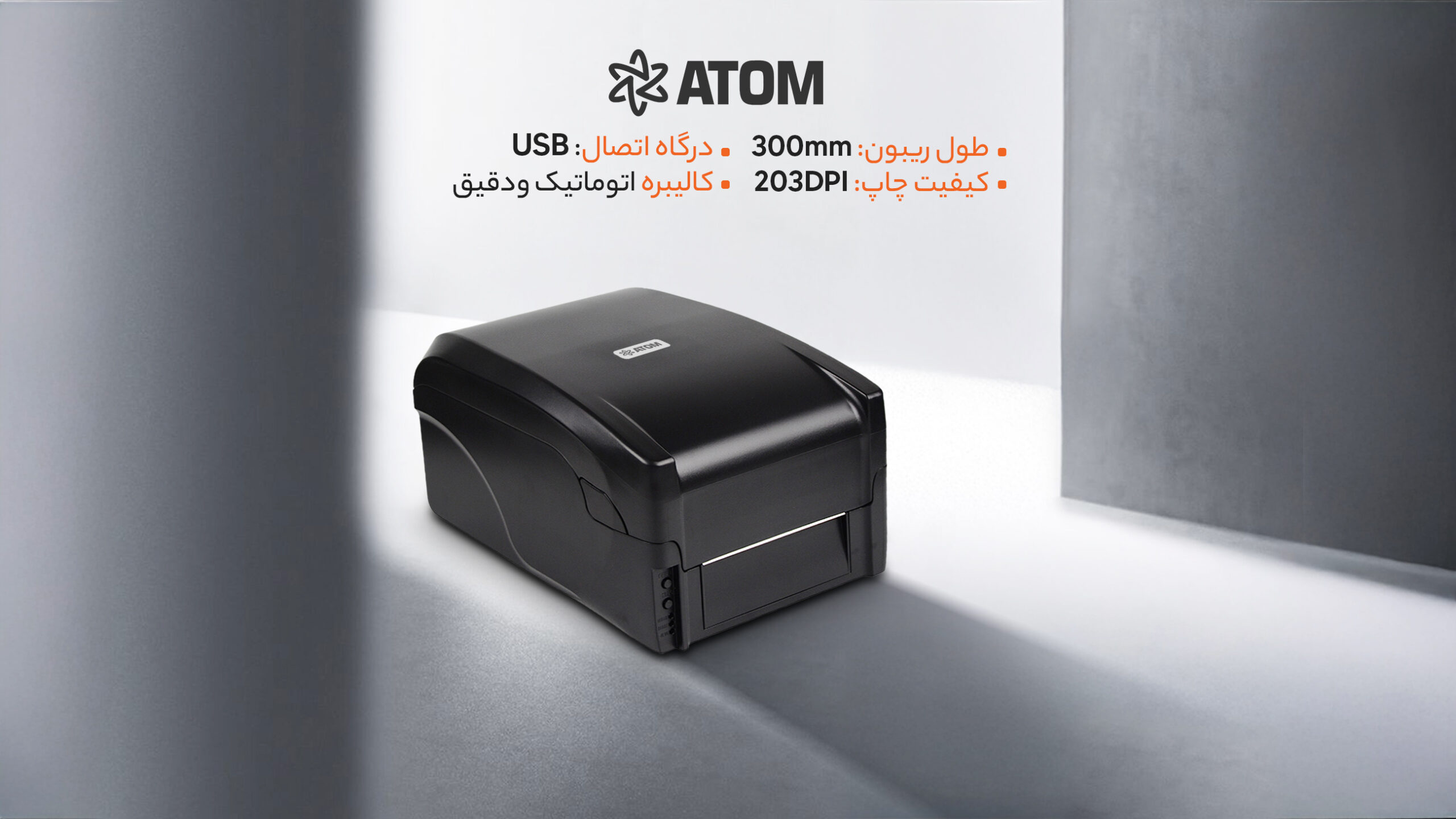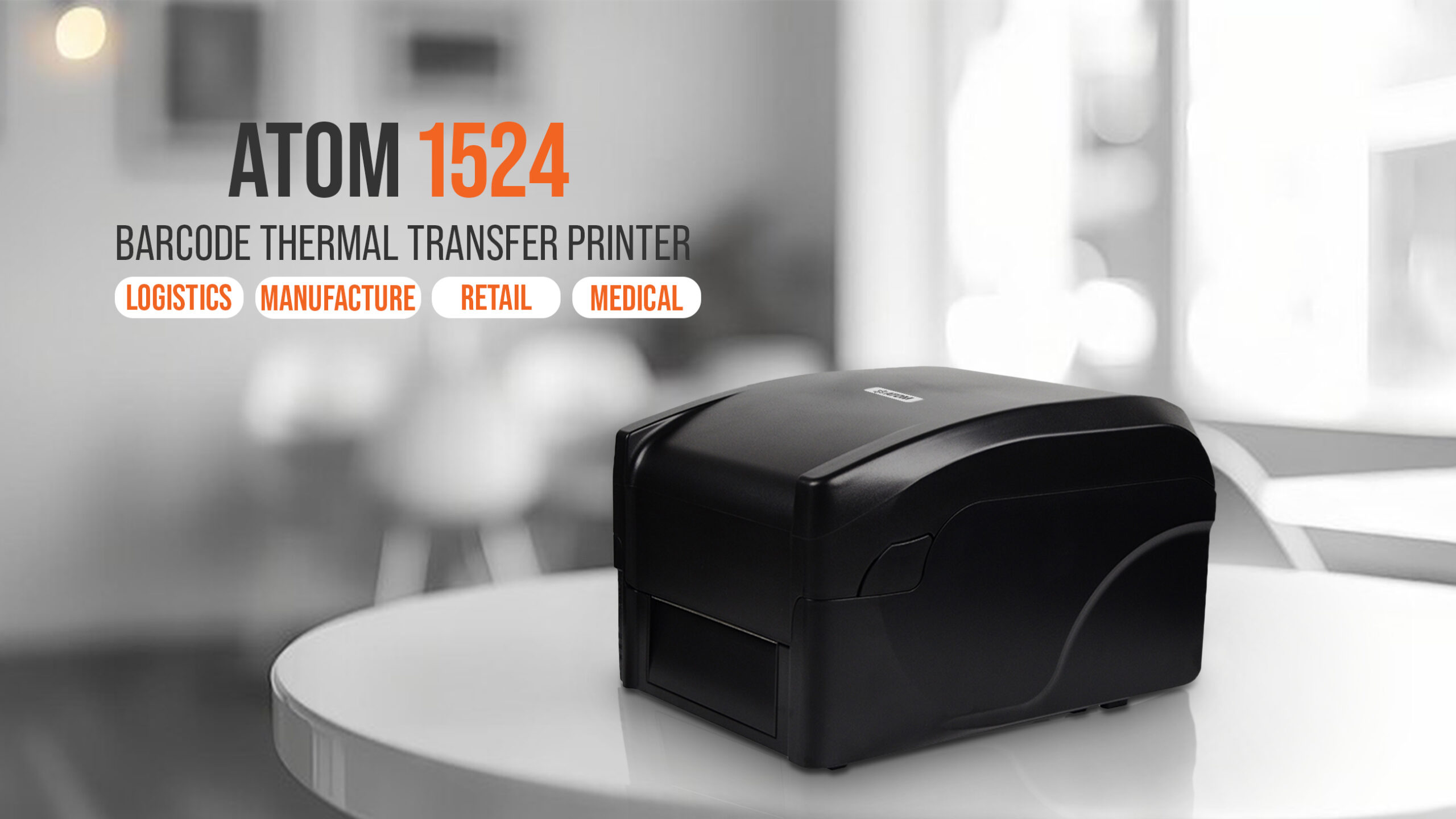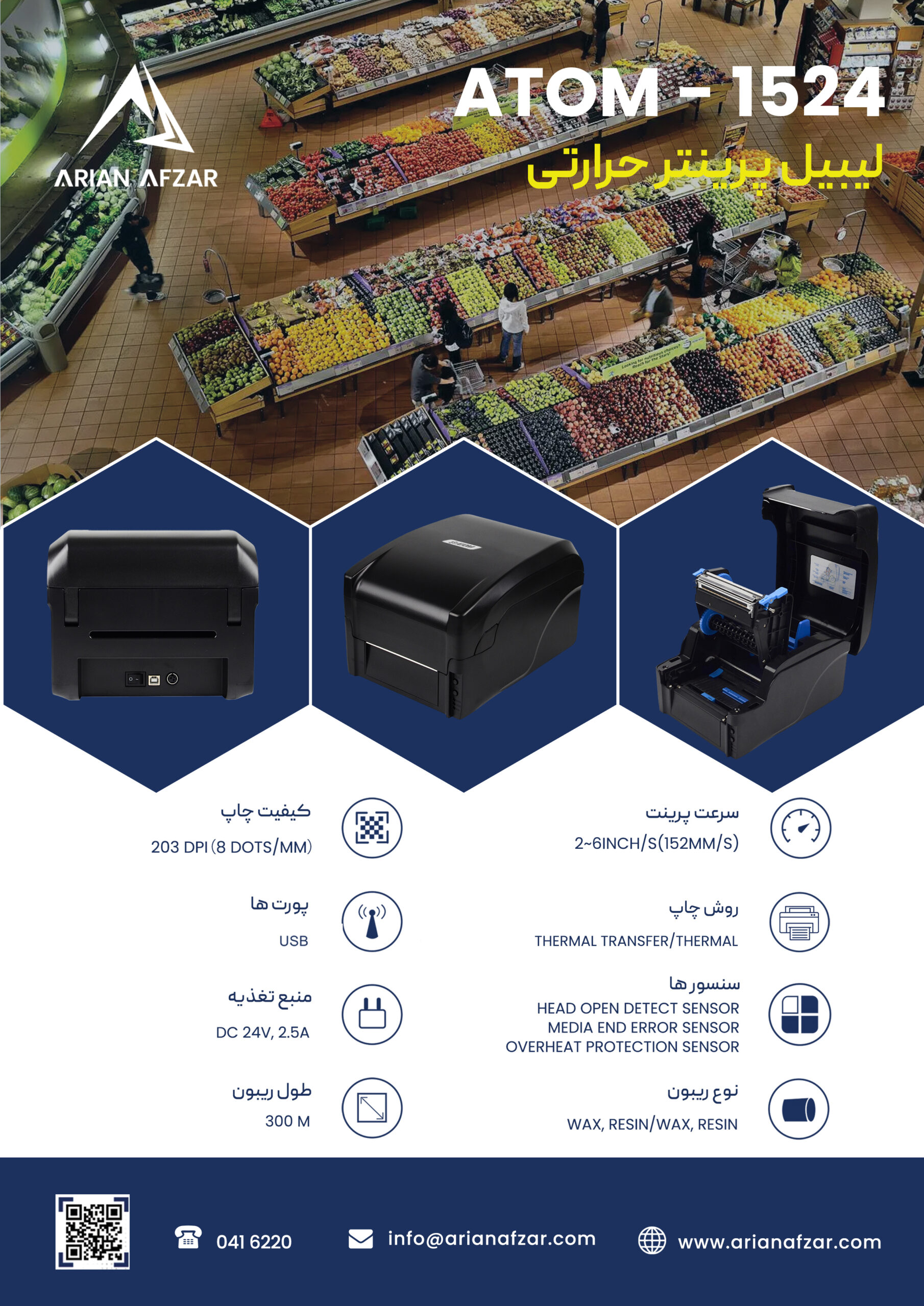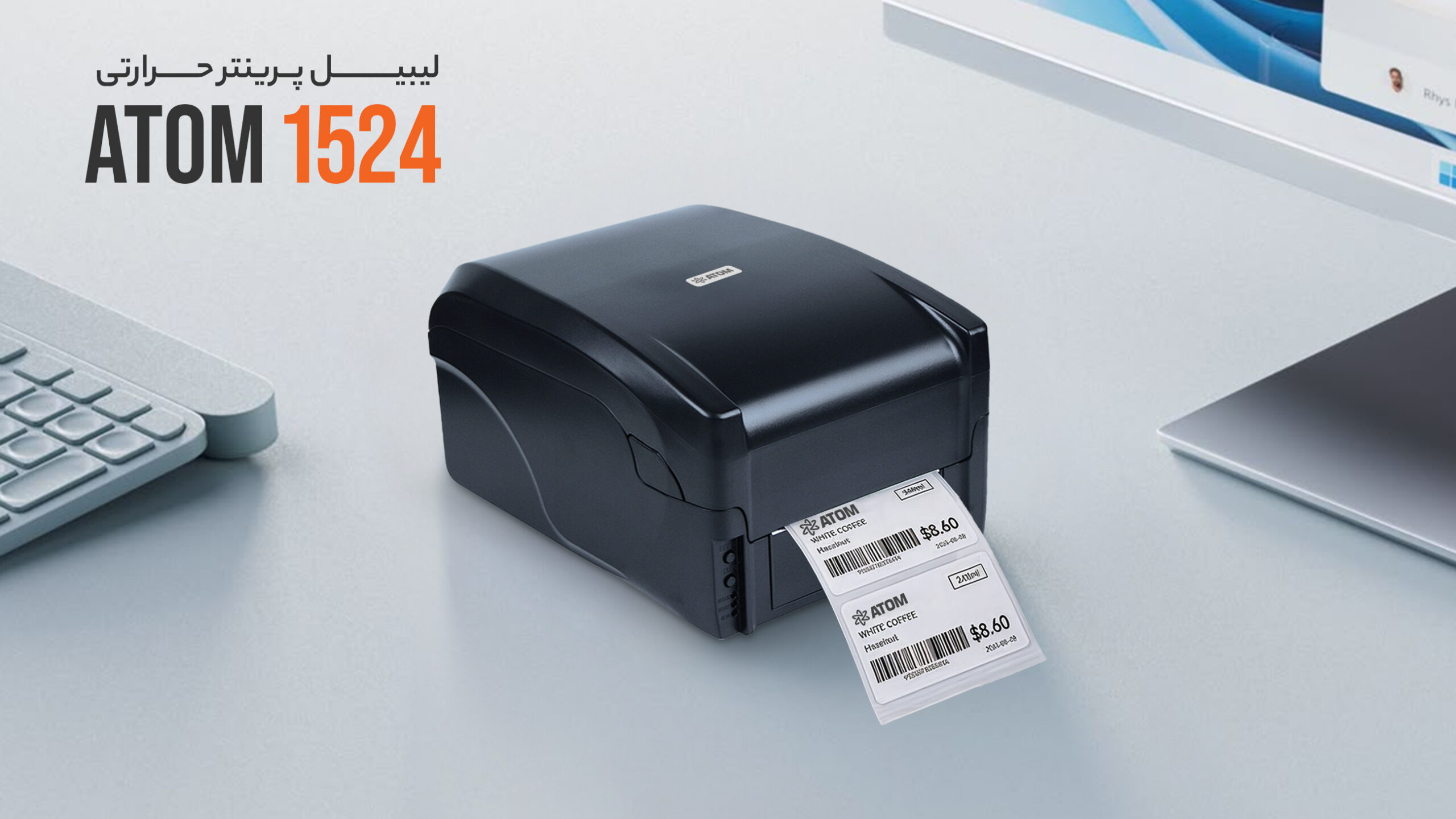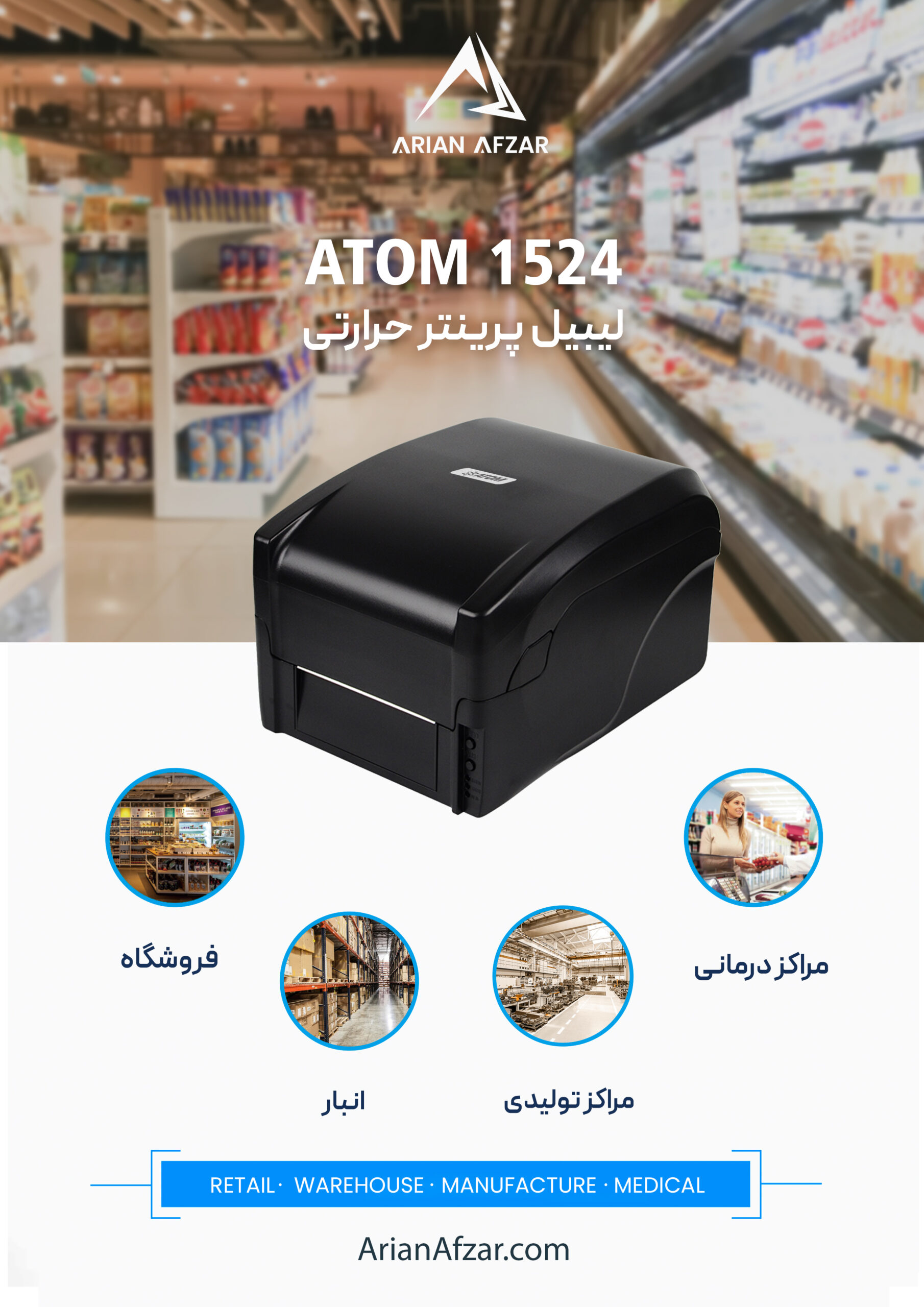 لیبل پرینتر حرارتی ATOM-1524 با کیفیت چاپ 203dpi، سرعت چاپ 152mm/s و قابلیت چاپ به دو روش Thermal و Thermal Transfer مناسب برای فروشگاهها، انبارداری و خطوط تولید.